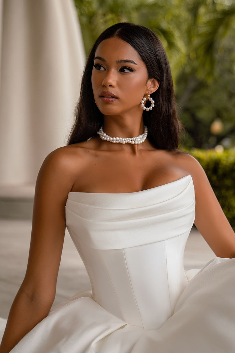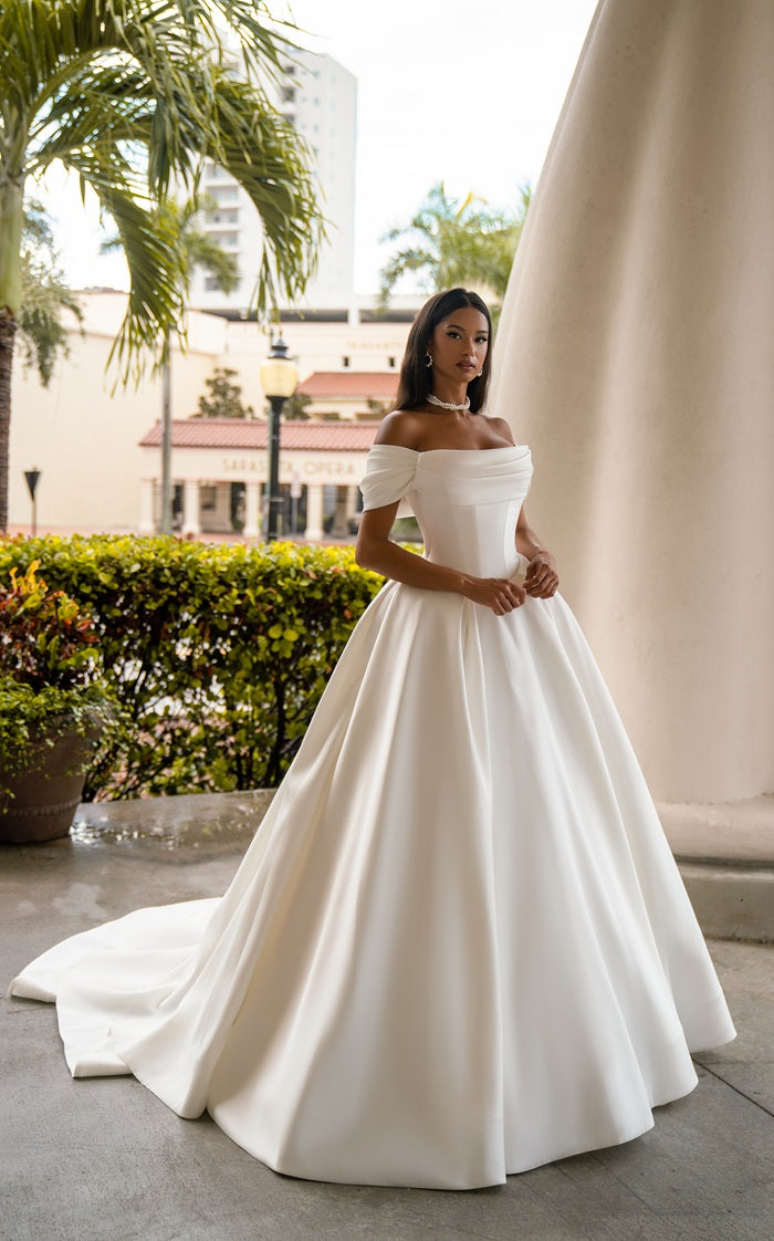 Manuela is a sophisticated luxury satin bridal gown designed for the discerning bride. Crafted from premium satin fabric, this gown drapes elegantly to create a refined silhouette that flatters and elongates the figure. The luxurious material catches light beautifully, ensuring you radiate understated glamour throughout your wedding day. Perfect for brides seeking timeless elegance with contemporary sophistication, Manuela combines expert tailoring with sumptuous fabrics to deliver a gown worthy of your most important celebration.